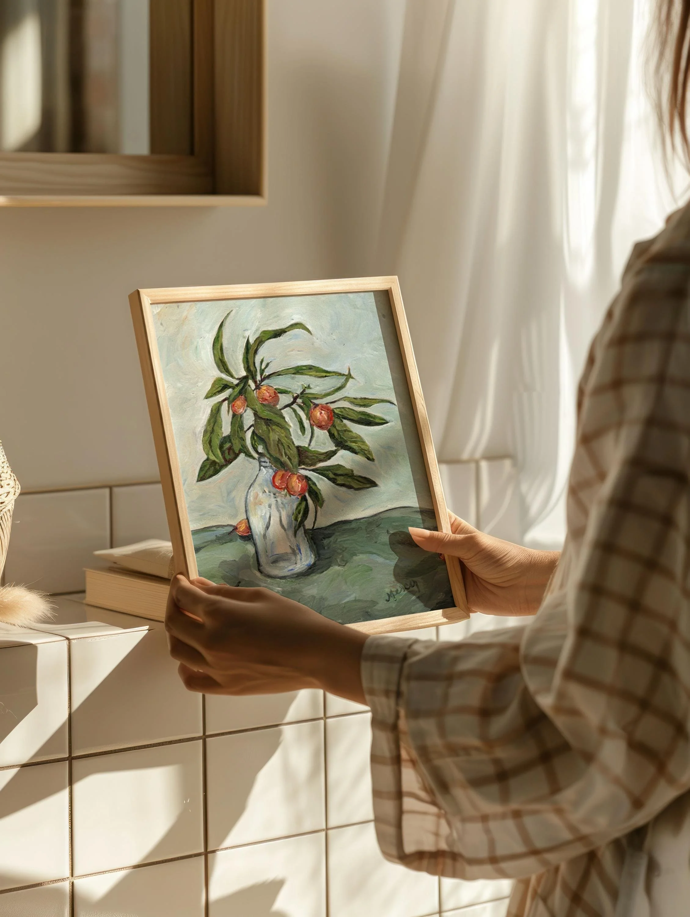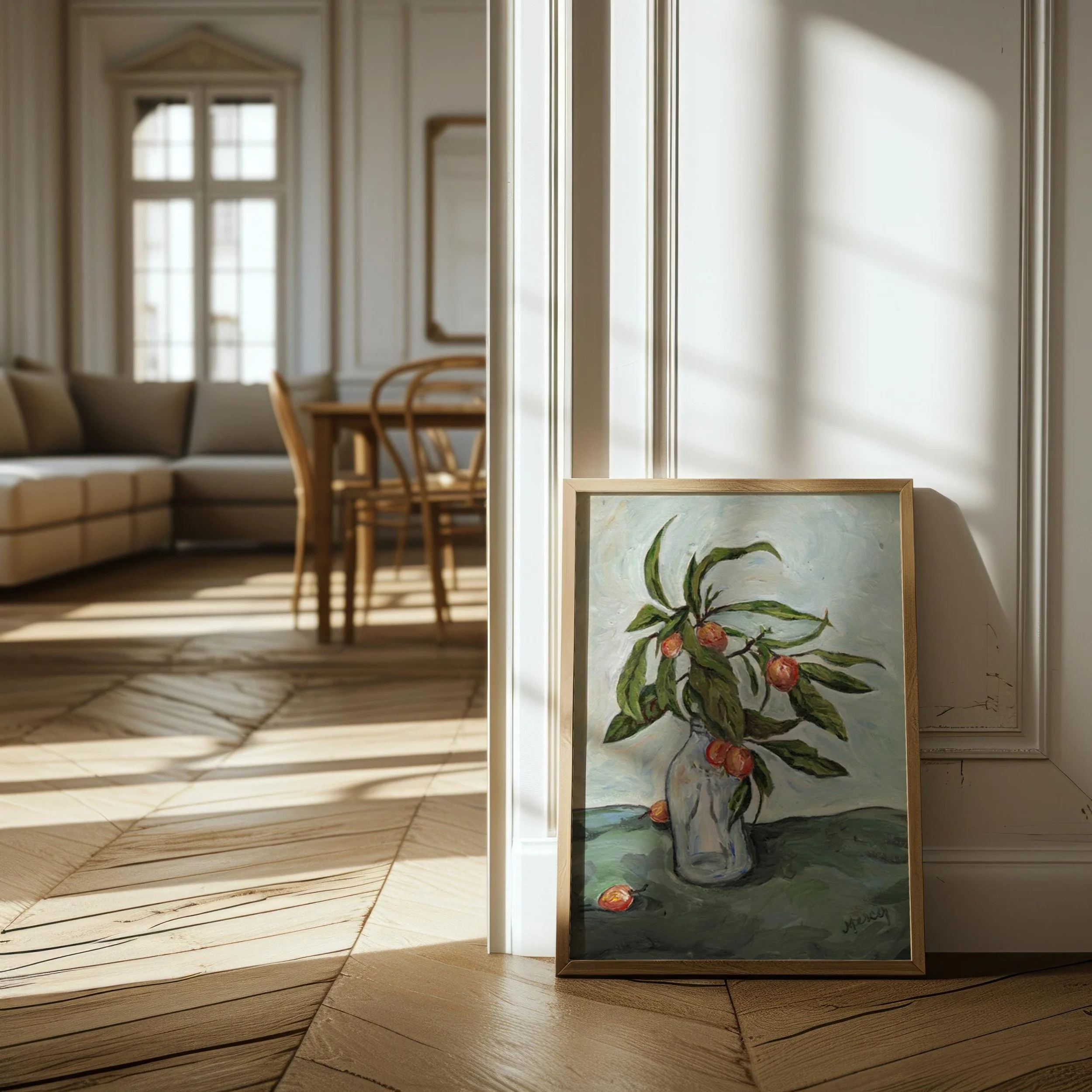 Becca Mercer’s acrylic painting, Kumquat Branches in Bottle (2025)