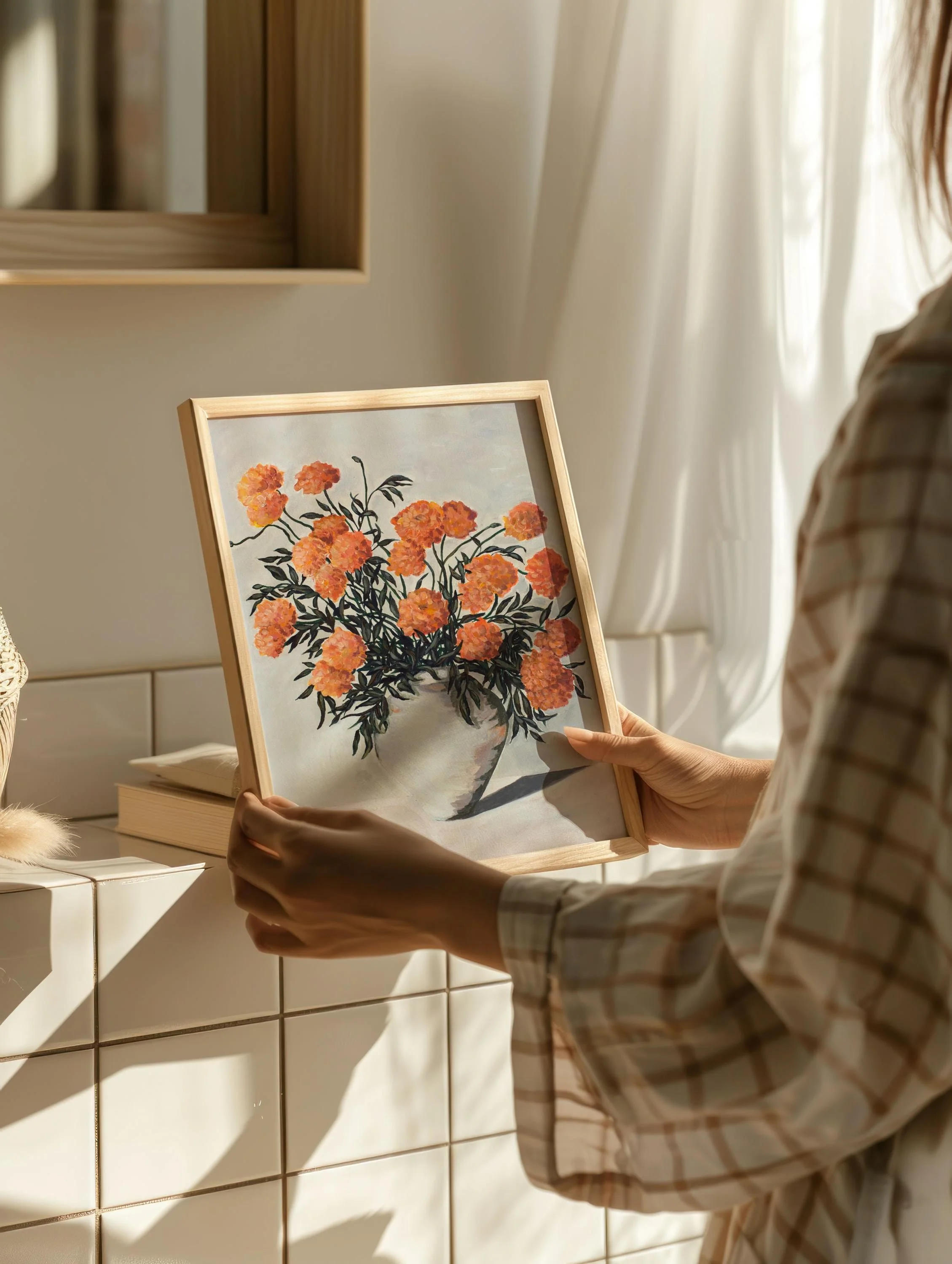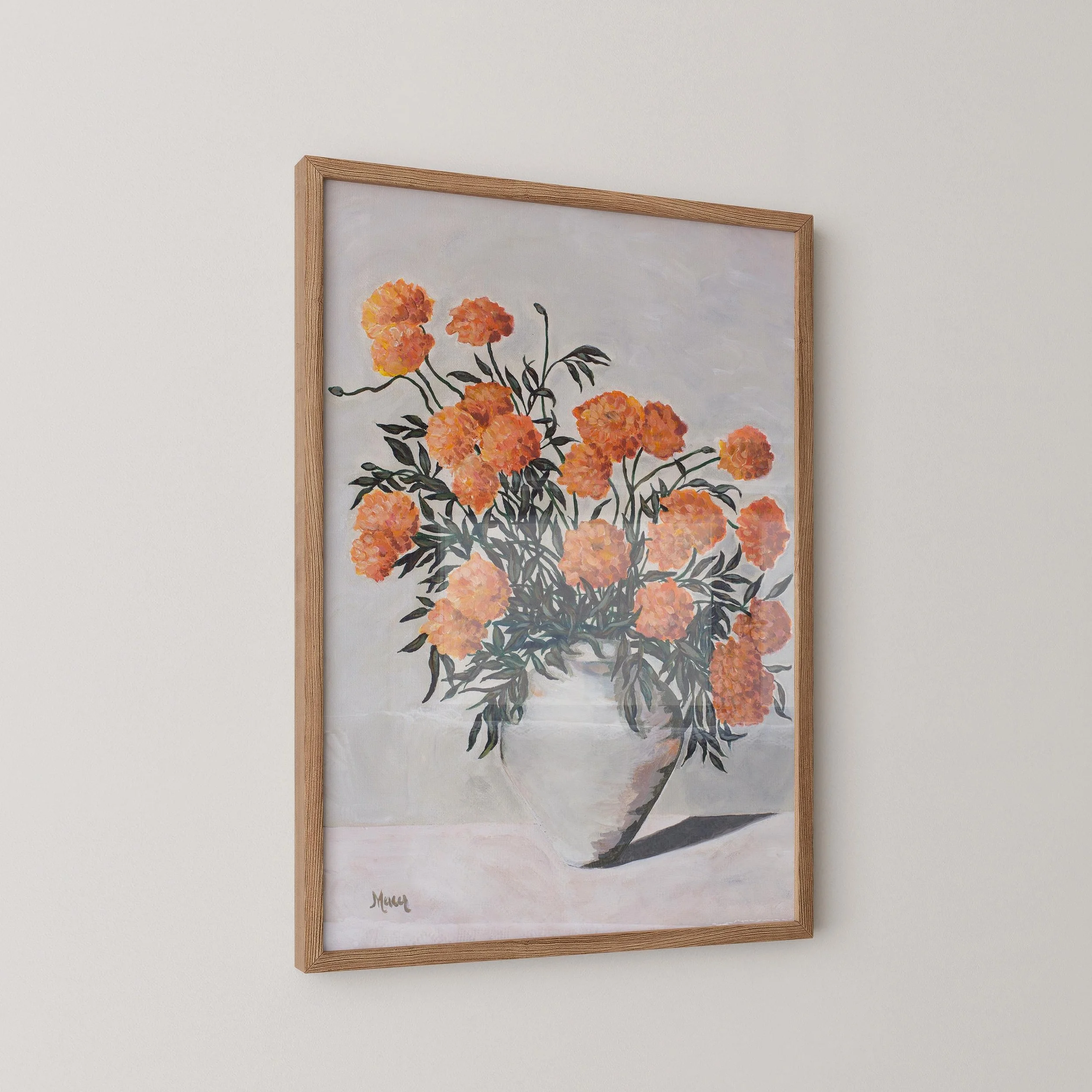 Marigolds Giclée Fine Art Print - Clean Neutral Floral in Ceramic Pot by Becca Mercer