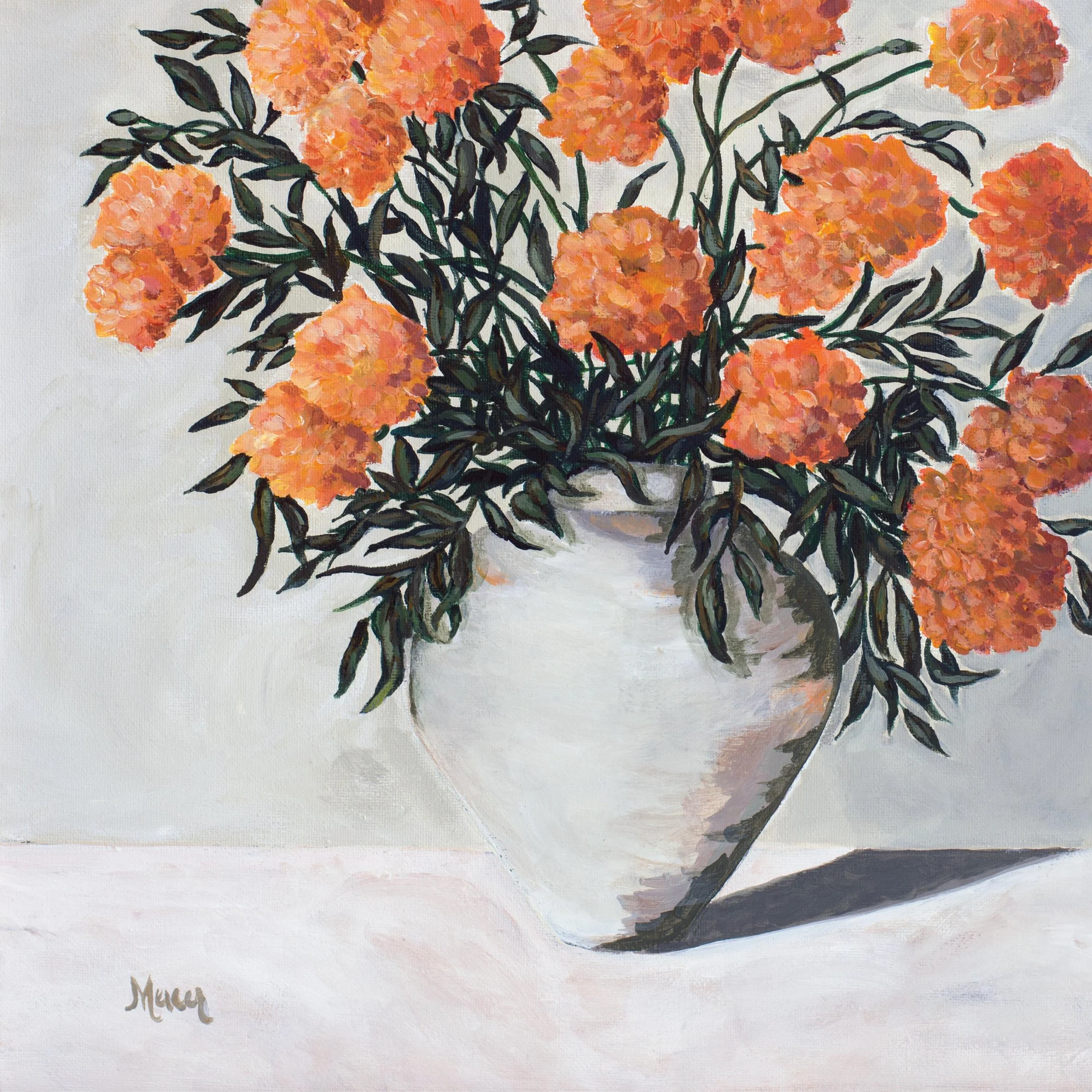 “Marigolds” by Becca Mercer (2023). Acrylic Painting on Canvas. A full arrangement of marigolds rises from a white ceramic vase, their dense orange blooms contrasted against a soft, neutral backdrop. The clustered forms and rhythmic stems create a sense of abundance without excess.